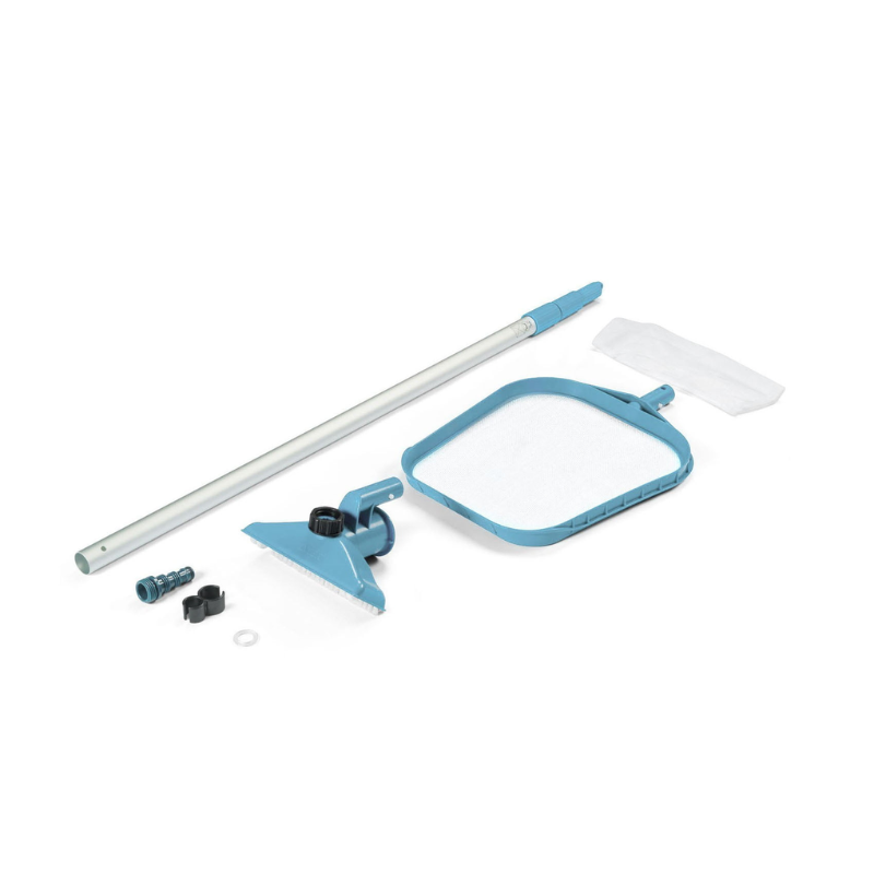 Set za čišćenje bazena BESTWAY je komplet za održavanje i čišćenje svih vrsta bazena. Set sadrži dršku dužine 203 cm, nastavak u obliku mrežice za sakupljanje površinskih nečistoća (lišće, grančice, itd.) i vakumski nastavak za uklanjanje nečistoća sa dna bazena. Bestway Vam nudi izuzetno praktičan komplet koji omogućava da brzo i jednostavno uklonite krupnije mehaničke nečistoće iz bazena.