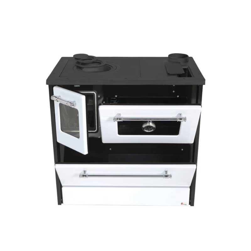 Rerna od emajliranog čelika: Lako se čisti i ravnomerno raspoređuje toplotu. Keramičko staklo: Otporno na visoke temperature i omogućava pogled u ložište ili rernu. Termometar u rerni: Omogućava preciznu kontrolu temperature tokom pečenja. Pleh i rešetka za pečenje: Uključeni dodaci za raznovrsnu pripremu hrane. Hromirane ručke: Elegantne i otporne na habanje.