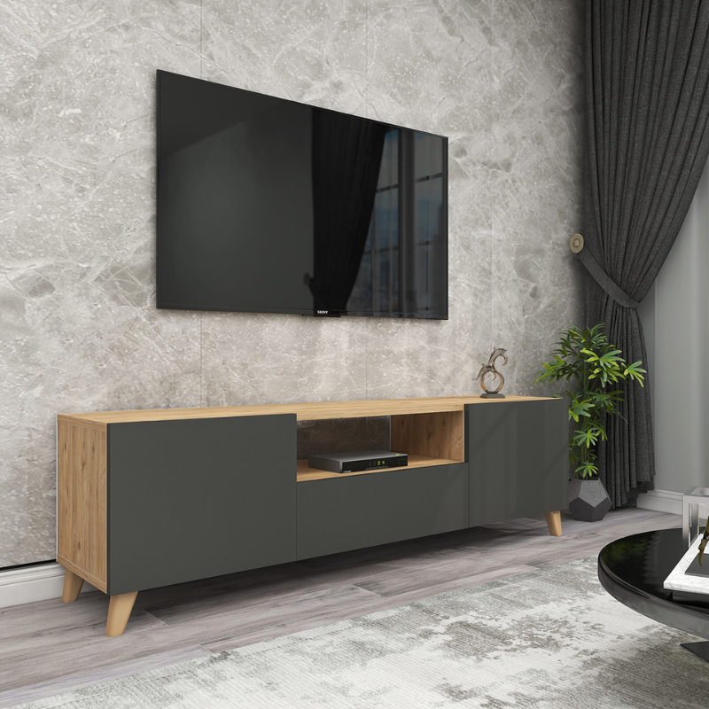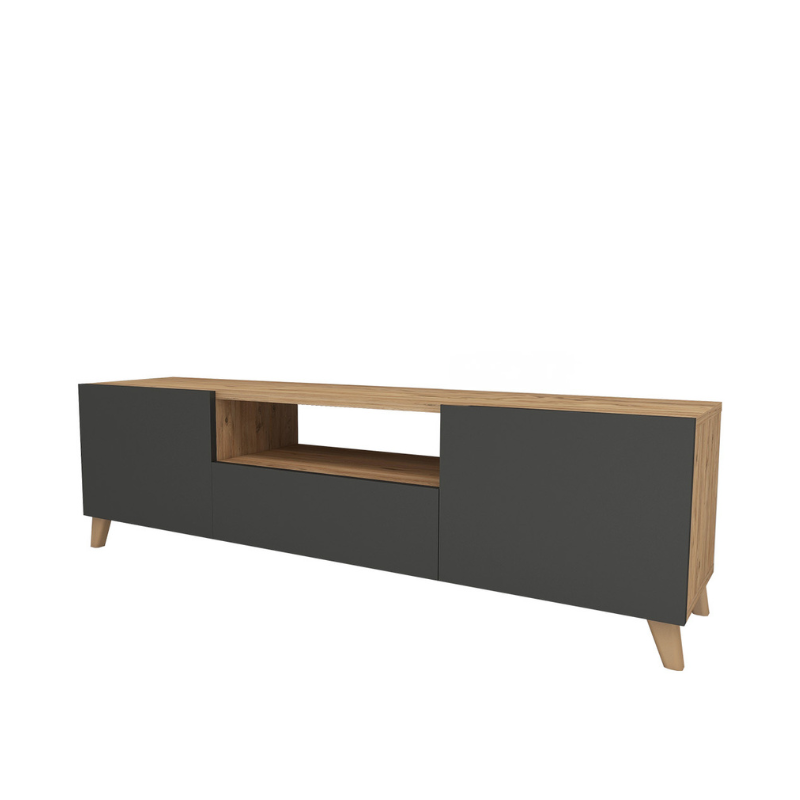 TV komoda u kombinaciji boja bor i antracit savršeno se uklapa u svaki enterijer. Visoke noge omogućavaju laku upotrebu za robotske usisivače, dok njen moderan izgled unosi stil i eleganciju u vaš dom.