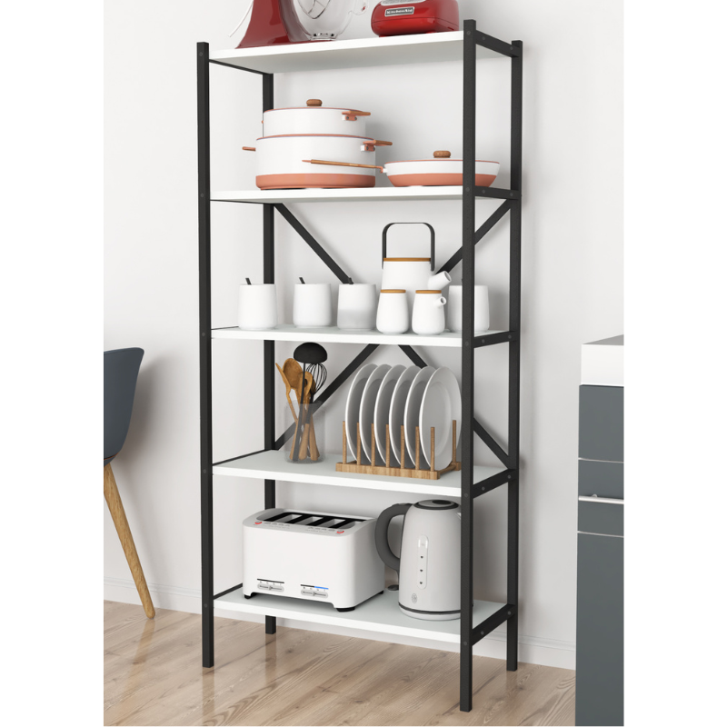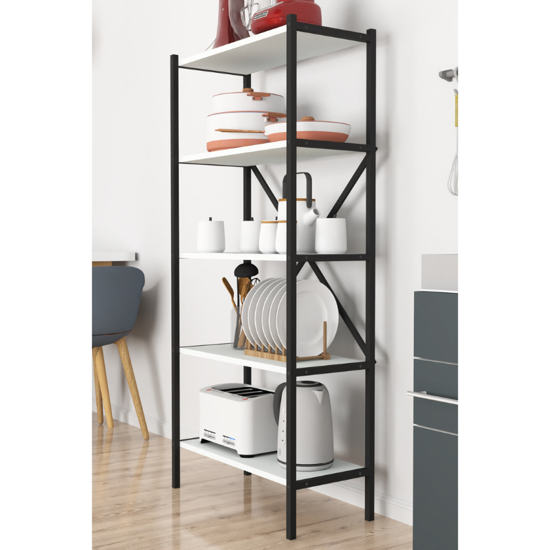 Metalna kuhinjska polica sa 5 nivoa, zahvaljujući modernom dizajnu, pogodna je za upotrebu u kuhinji, ali i u drugim prostorijama doma.