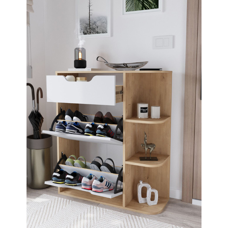 Smyrna spuštajući stalak za cipele, s 2 pretinca i ladicama, isporučuje se rastavljen u svojoj posebnoj kutiji. Naš stalak za cipele izrađen je od visokokvalitetne iverice debljine 18 mm. Proizvod posjeduje TSE, Evropske unije EN, ISO 9001 i FSC certifikate. U skladu je sa E1 standardima i ne sadrži kancerogene tvari.