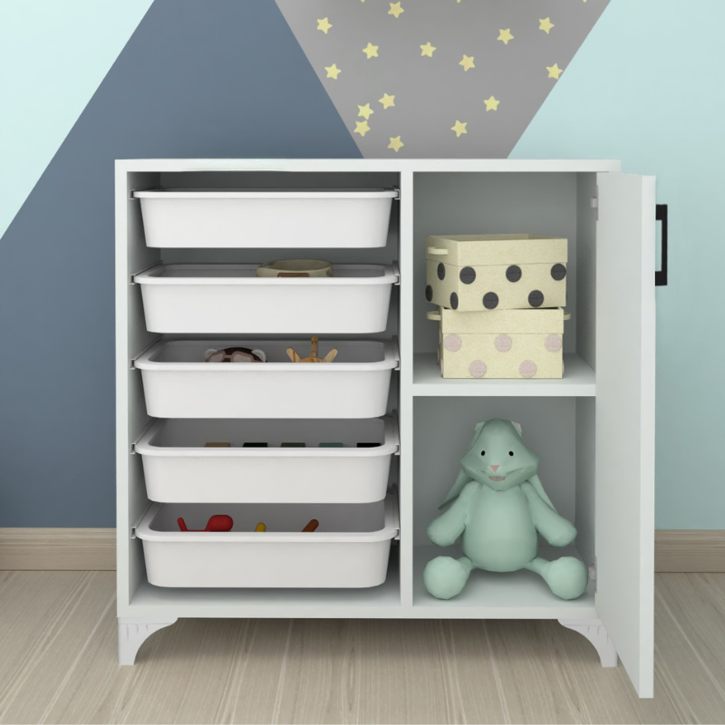 Ormarić za igračke sa 5 korpi, zahvaljujući modernom dizajnu, pogodan je za dečju sobu, ali i za upotrebu u drugim prostorijama doma.
