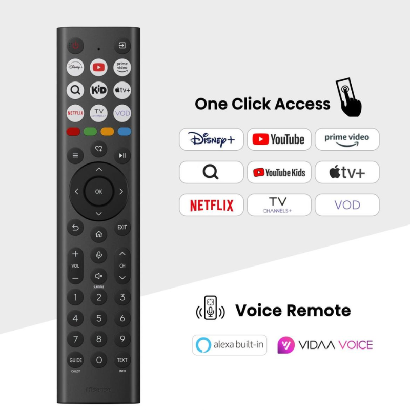 Isprobajte Hisense glasovnu kontrolu na daljinskom i podignite upravljanje televizorom na viši nivo praktičnosti. Jednim pritiskom na dugme aktivirate glasovne komande. Lako se krećite kroz serije, podešavajte jačinu zvuka ili komunicirajte sa virtuelnim asistentima.