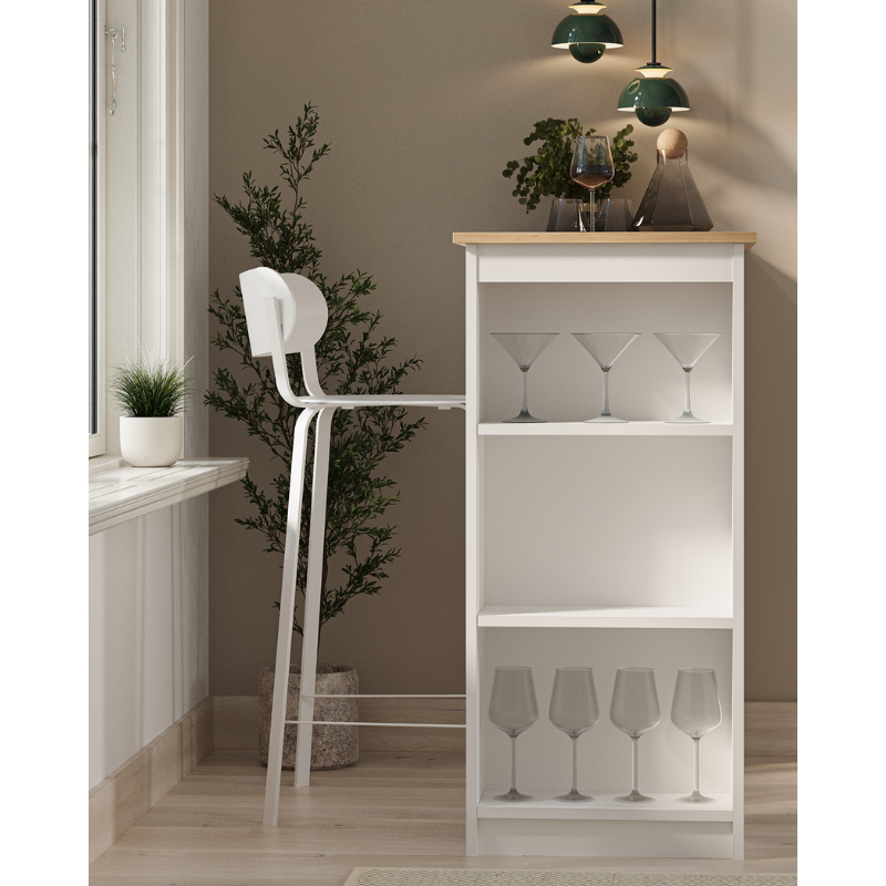 Njegov dizajn s visokim nogama čini ga kompatibilnim s barskim stolicama. Sistem polica s 3 nivoa sa strane omogućava organizirano odlaganje čaša, boca, pribora i pribora za posluživanje. Može se koristiti svakodnevno, kao i kao dekorativni element za bar.