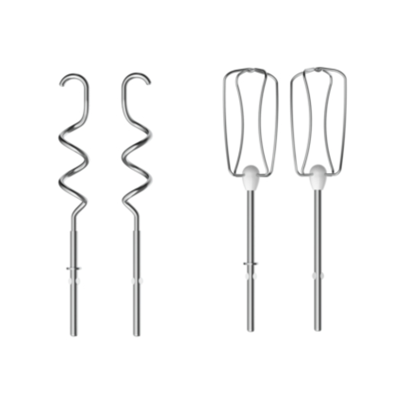 Dvije metlice od nehrđajućeg čelika osiguravaju lagane pripravke izmiješane i umućene do savršenstva, s dvije kuke za tijesto od nehrđajućeg čelika za pokrivanje teških tijesta i krema.